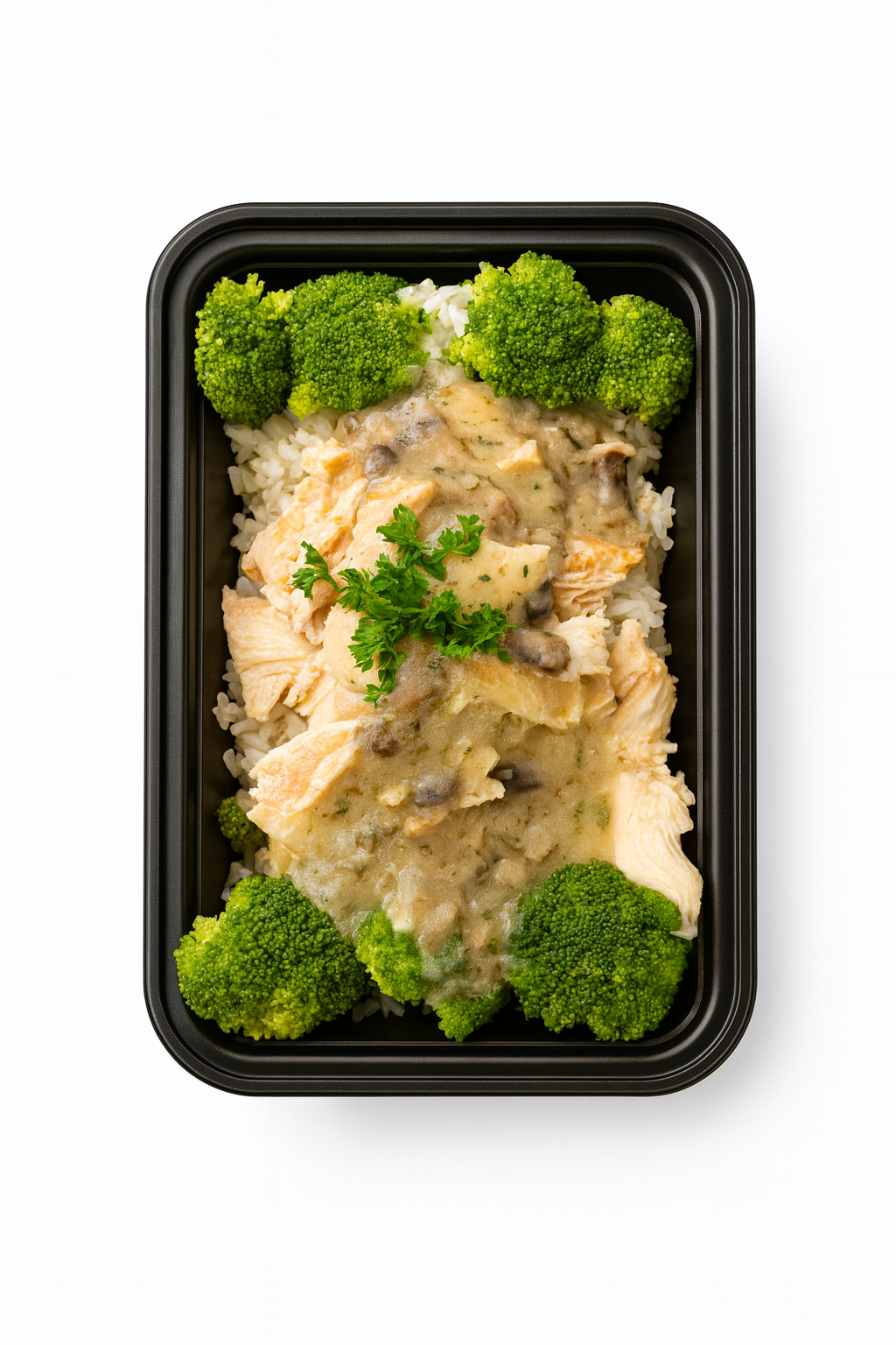 Tender protein served over jasmine rice and paired with crisp broccoli, all topped with our signature creamy mushroom and herb sauce — a blend of sautéed mushrooms, garlic, and a touch of thyme for that rustic, home-style flavor.